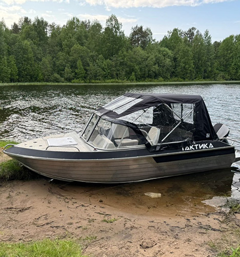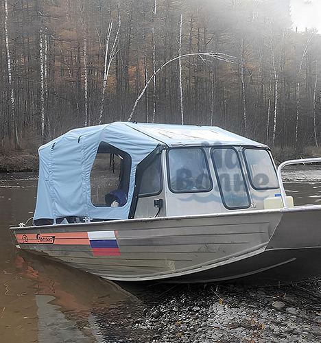 Тент с задней дверью для выхода к мотору, небольшими боковыми окнами и усиленными краями для установки застёжек. Изготовлен из специализированной тентовой ткани Оксфорд 600 повышенной плотности